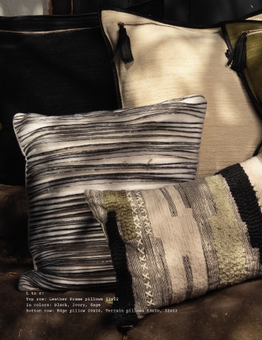 L to r: Top row: Leather Frame pillows 22x22 In colors: Black, Ivory, Sage Bottom row: Edge pillow 20x20, Terrain pillows 13x20, 22x22