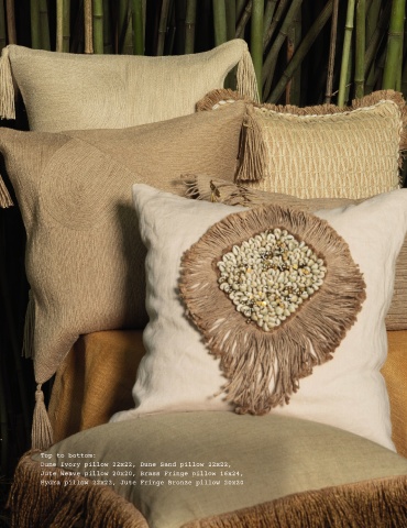 Top to bottom: Dune Ivory pillow 22x22, Dune Sand pillow 22x22, Jute Weave pillow 20x20, Brass Fringe pillow 16x24, Hydra pillow 22x22, Jute Fringe Bronze pillow 20x20